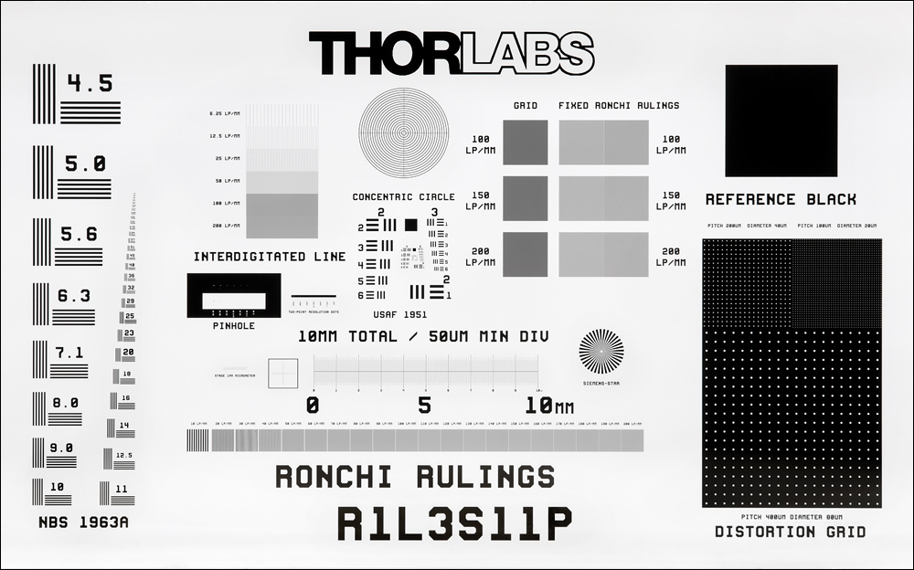 Настраиваемая таблица для измерения разрешающей способности предназначена для обучения теории Аббе и оптике Фурье. Детали на таблице имеют хромированное покрытие и включают в себя звезду Сименса, шкалы Ронки, наборы полосок USAF 1951 и NBS 1963A, встречно-штыревые линии, отверстия для положительной и отрицательной маски, сетку дисторсии и концентрические круги.