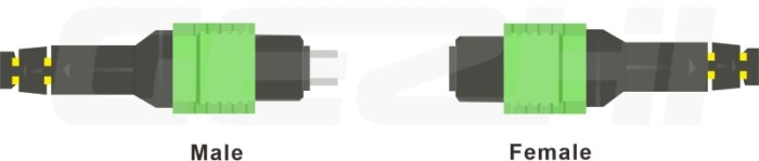 Интерфейсы MPO на активном оборудовании являются штекерными (с выводами), и во избежание повреждения приемопередатчика патч-корды MPO должны быть штекерными (без выводов).