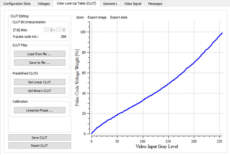 Пространственный модулятор поставляется с программным обеспечением Configuration Manger на основе графического интерфейса пользователя (GUI). Configuration Manager можно использовать для изменения геометрических параметров, яркости, контрастности и электрооптического отклика путем применения новой гамма-кривой или другой схемы цифрового привода. Для таких расширенных калибровок используется интерфейс USB.