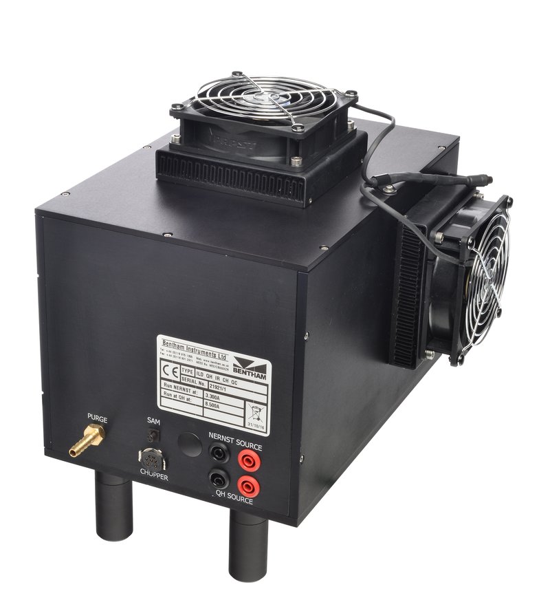 Источник света ILD-QH-IR Bentham – это широкополосный осветитель для использования в видимом и дальнем инфракрасном диапазоне. В корпусе расположены QTH-лампа мощностью 100 Вт и SiN-ИК-излучатель мощностью 40 Вт с автоматизированным выбором между ними, эффективное сопряжение обеспечивается с помощью конденсорной линзы CaF2 (QTH) и внеосевого эллиптического рефлектора (SiN). Опции включают в себя интеграцию оптического модулятора и quick change адаптера для подключения к входной спектральной щели монохроматора. Стабильная работа обоих источников может быть обеспечена с помощью стабилизированного по току источника питания лампы 610 Bentham.