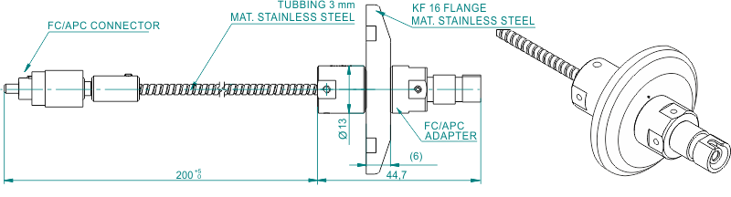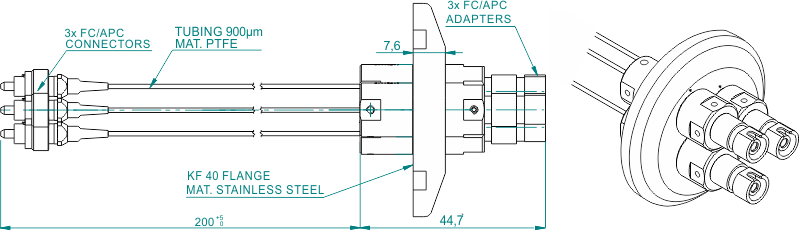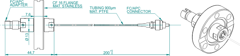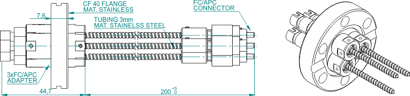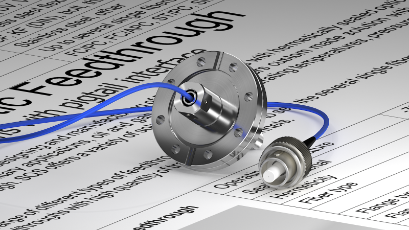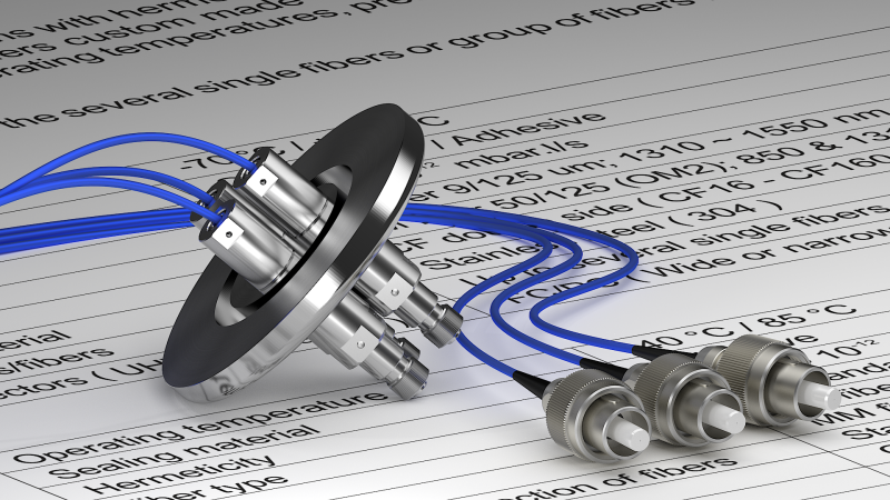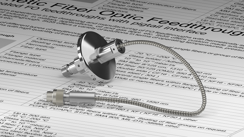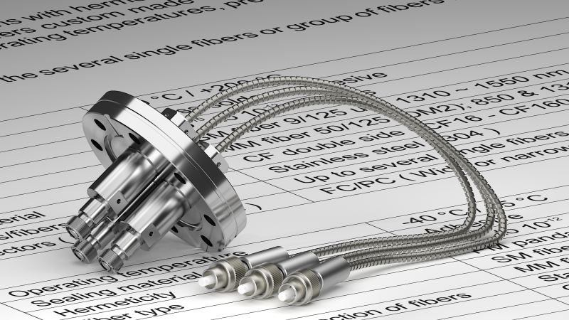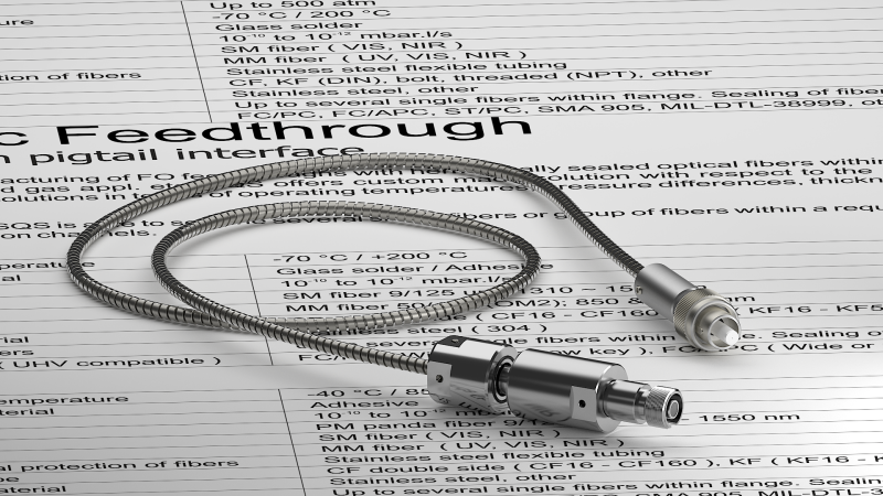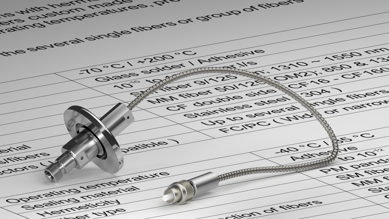 Вакуумные гибридные выводы доступны с интерфейсами адаптеров FC и SMA905 и со многими видами оптических волокон (SM, MM и PM). Оптическое волокно может быть защищено трубкой из ПТФЭ или гибкой оплеткой из нержавеющей стали.