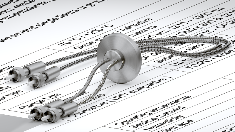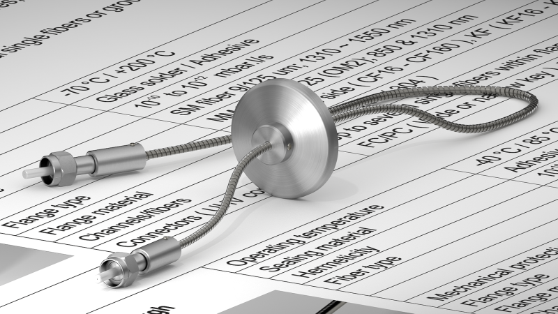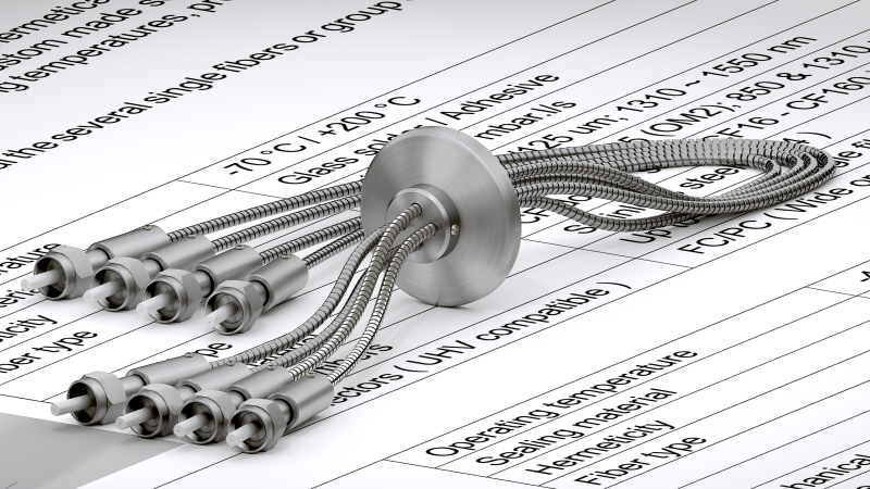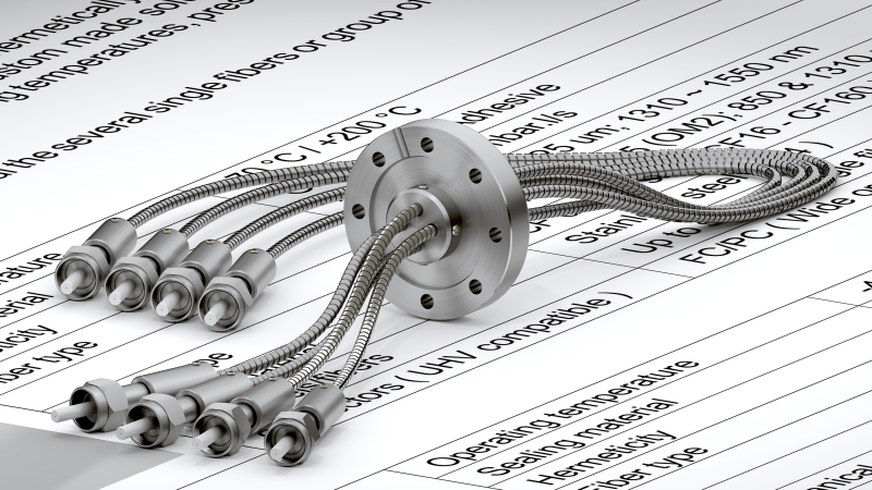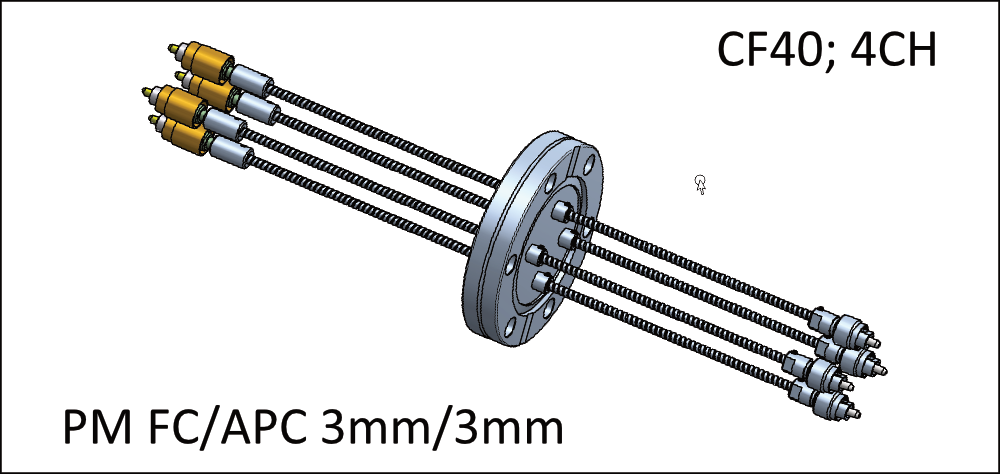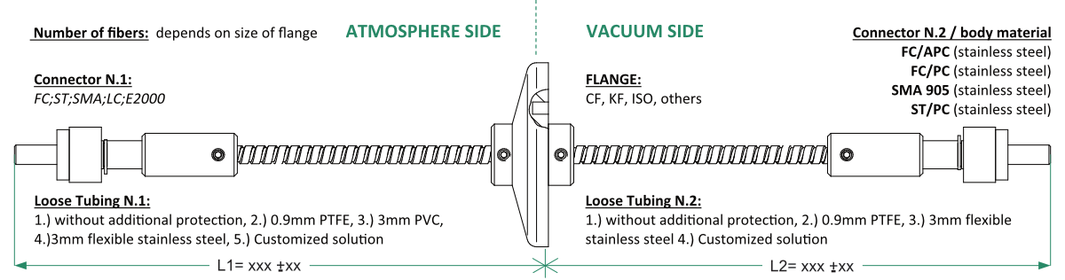 Производственный процесс и используемые материалы позволяют предлагать выводы для волокна, подходящие для высоких и сверхвысоких уровней вакуума от 10-10 до 10-12 мбар·л/с. Вывод оптоволоконных кабелей может быть механически защищен трубкой и заканчиваться различными типами оптических соединителей (FC / PC, FC / APC, SMA905,…).