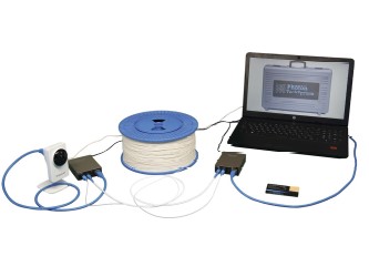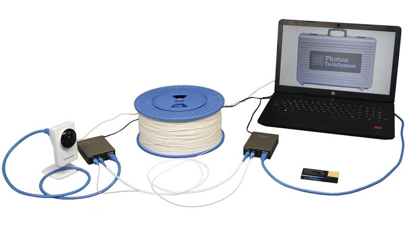 Данный демонстрационный набор включает в себя катушку одномодового оптоволоконного кабеля длиной 1500 м, оснащенного коннекторами типа SC-SC, позволяющими подключать оптическое волокно без существенных потерь в качестве сигнала. В качестве источника сигнала используется ip-камера, генерирующая потоковый видеосигнал. Она подключена к медиаконвертеру, преобразующего электронные сигналы в оптические.