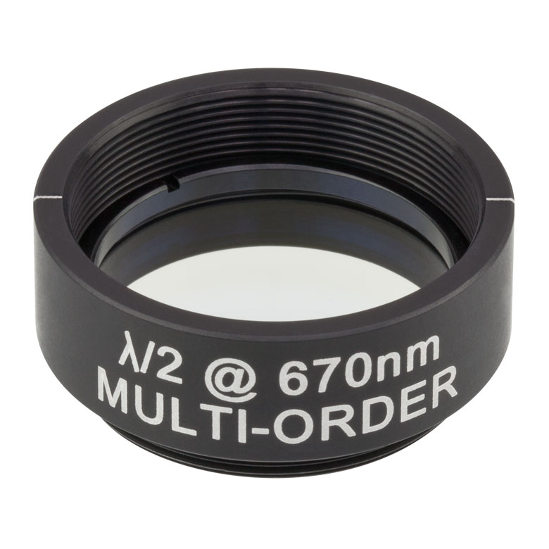 WPMH10M-670 — полуволновая фазовая пластинка множественного порядка производства Thorlabs, диаметр апертуры Ø1", установленная в оправу с внутренней резьбой SM1. Пластинка рассчитана на длину волны 670 нм и реализует фазовую задержку λ/2 за счёт большой оптической толщины двоякопреломляющего кристалла. Такое исполнение обеспечивает экономичный способ управления линейной поляризацией в системах с фиксированной длиной волны.