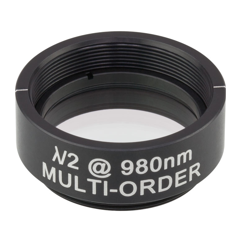 WPMH10M-980 — полуволновая фазовая пластинка множественного порядка производства Thorlabs, диаметр апертуры Ø1", установленная в оправу с внутренней резьбой SM1. Пластинка рассчитана на длину волны 980 нм и реализует фазовую задержку λ/2 за счёт большой оптической толщины двоякопреломляющего кристалла. Такое исполнение обеспечивает экономичный способ управления линейной поляризацией в системах с фиксированной длиной волны.