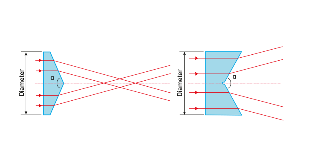 Аксиконы (конические линзы) известны благодаря своей способности преобразовывать коллимированный гауссов пучок в приближение недифрагирующего бесселевого пучка в ближнем поле и в форме кольца в дальнем поле. Чаще всего они используются в тандеме с другими типами линз. Компания Optogama обеспечивает плоско-выпуклые и плоско-вогнутые конические линзы. Эти линзы имеют одну выпуклую поверхность или одну вогнутую коническую поверхность соответственно, тогда как вторые поверхности являются плоскими в обоих случаях.