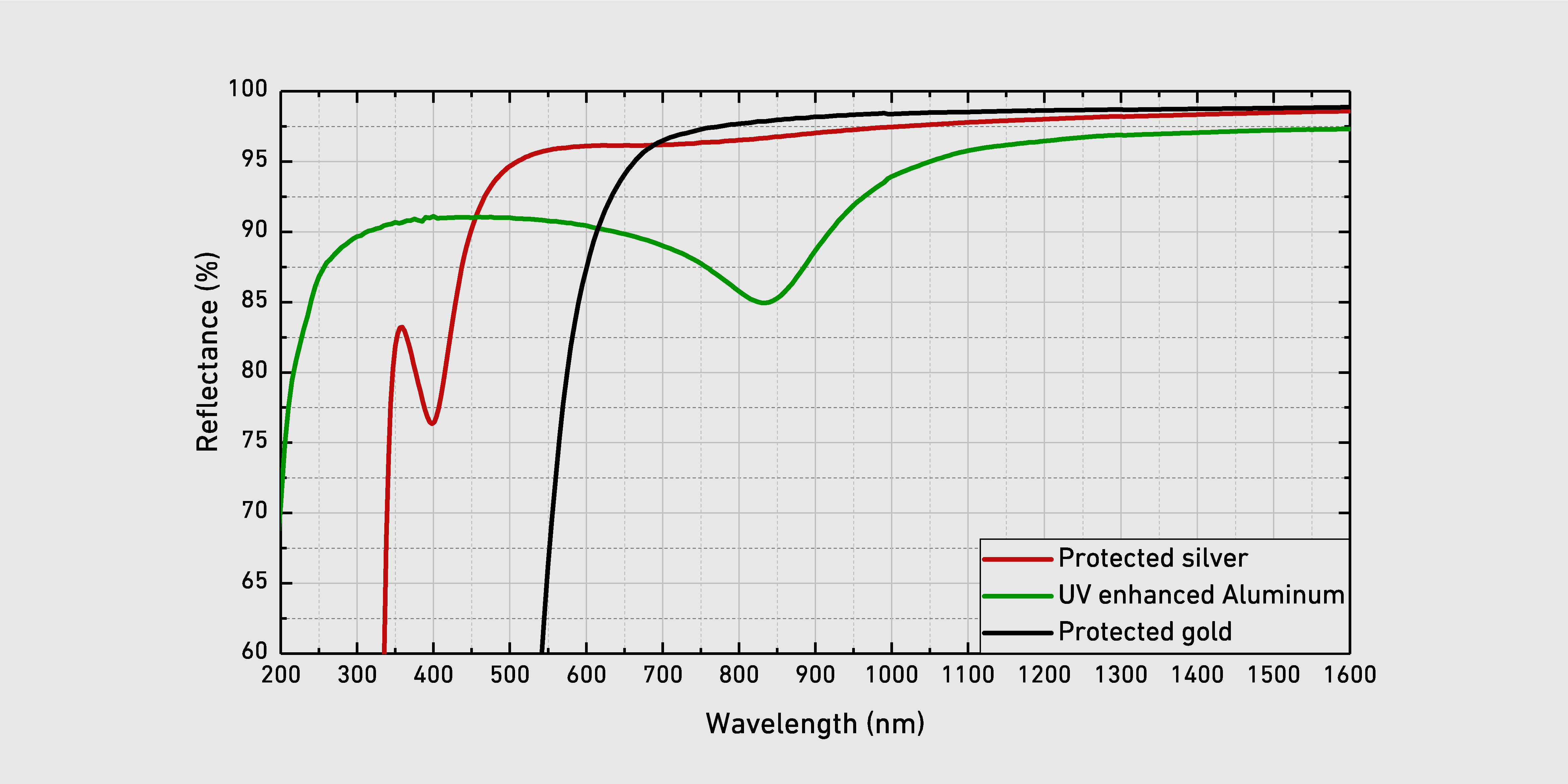 Зеркала с металлическим покрытием Optogama демонстрируют относительно равномерную отражательную способность в широком диапазоне длин волн. Они практически не чувствительны к углу падения и состоянию поляризации света, поэтому их потери на отражение значительно выше по сравнению с диэлектрическими тонкопленочными зеркалами.
