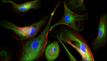 Флуоресцентное изображение клеток BPAE, полученное с помощью монохромной камеры CS235MU. 16-битные изображения в полном разрешении, приведенные выше, можно просматривать с помощью ThorCam, ImageJ или другого научного программного обеспечения для обработки изображений. Они могут отображаться неправильно в средствах просмотра изображений общего назначения.