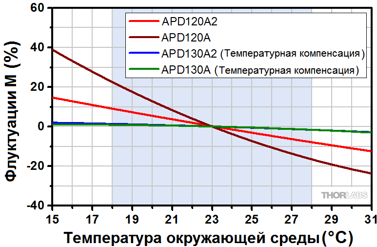 Лавинные фотодиоды используют внутренний механизм усиления для повышения чувствительности. Высокое напряжение обратного смещения, приложенное к диоду, создает сильное электрическое поле. Когда фотон поглощается, образуя пару электрон-дырка, электрическое поле ускоряет электроны, что приводит к образованию вторичных электронов в результате ударной ионизации. Электронная лавина приводит к усилению тока в сотни раз. Данный эффект описывается коэффициентом лавинного умножения (M), который является функцией напряжения обратного смещения и температуры. Коэффициент M возрастает при уменьшении температуры и увеличении напряжения обратного смещения.Модели детекторов на лавинных фотодиодах с температурной компенсацией оснащены встроенными терморезисторами, которые позволяют регулировать напряжение смещения для компенсации влияния температуры на коэффициент лавинного умножения. На графике представлено сравнение характеристик моделей с и без температурной компенсации.