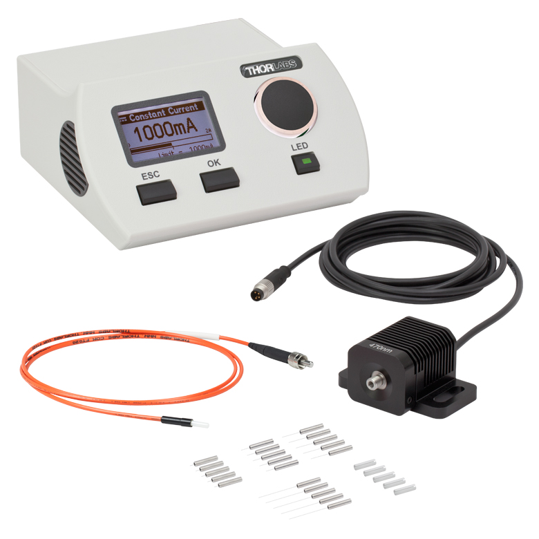 —OGK4 - Комплект приборов для оптогенетики: светодиод с оптоволокном, соединительный кабель, 5 стыковочных рукавов, 20 оптоволоконных канюль (стальной наконечник Ø2.5 мм, оптоволокно Ø400 мкм)