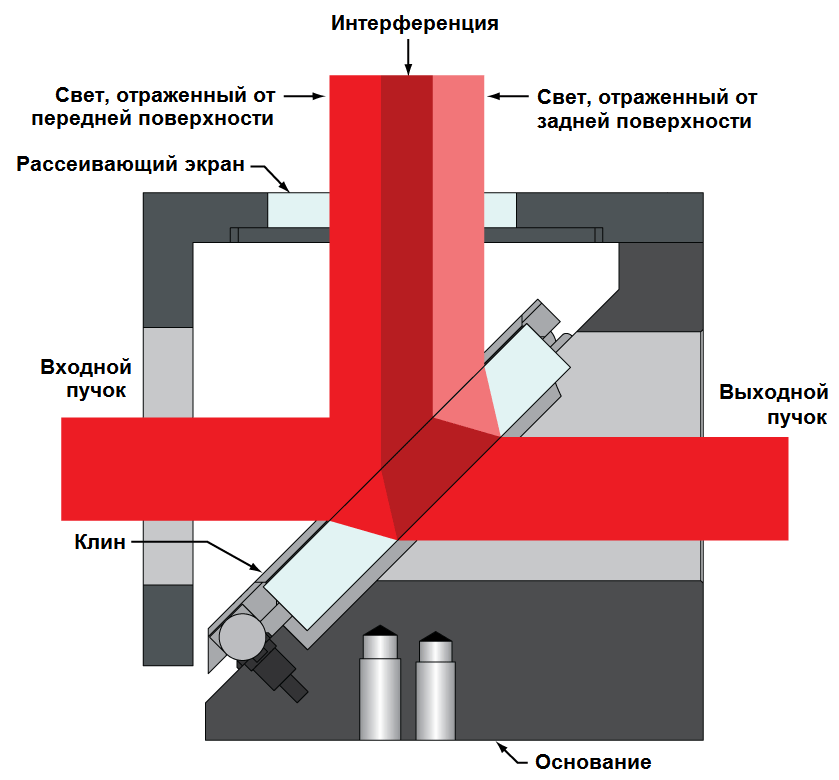 Клиновидная пластинка изготовлена из кварцевого стекла для работы в УФ диапазоне. Угол между боковыми гранями клина оптимизирован для разных пластин в соответствии с диапазоном диаметров пучков (1- 50 мм), для которых она предназначена. Так как свет падает на платину под углом 45°, интенсивность интерференционной картины зависит от поляризации света. Максимальная интенсивность будет наблюдаться, когда поляризация перпендикулярна плоскости падения света.